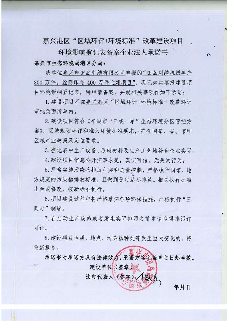 關于田島刺繡機繡年產 300 萬件,絲網印花 400 萬件遷建項目環(huán)境影響登記表備案法人承諾書公示